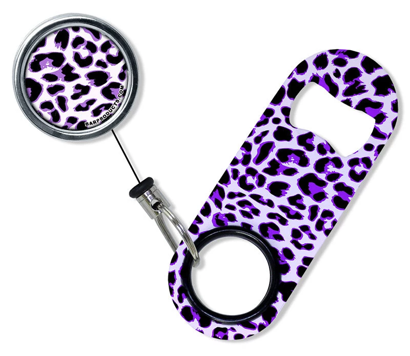 Clip your bottle opener practically anywhere for quick, convenient access… and do it with style! Showcasing a full color Purple Cheetah pattern design, we have tastefully decorated our trendy mini bottle opener to match this quality retractable reel. Clip it to your belt, pants, pocket, purse or anywhere else you can think it would come in useful. Don’t miss out on the price break when bought as a set, or purchase them separately to mix and match. This retractable reel also works in conjunction with our other bottle opener styles!