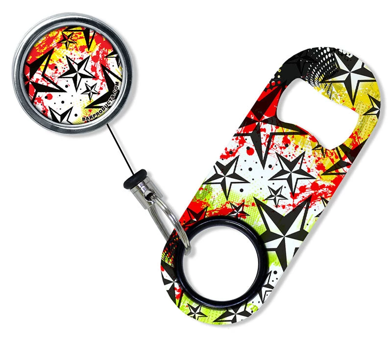 Clip your bottle opener practically anywhere for quick, convenient access… and do it with style! Showcasing a full color Rock Star Red pattern design, we have tastefully decorated our trendy mini bottle opener to match this quality retractable reel. Clip it to your belt, pants, pocket, purse or anywhere else you can think it would come in useful. Don’t miss out on the price break when bought as a set, or purchase them separately to mix and match. This retractable reel also works in conjunction with our other bottle opener styles!