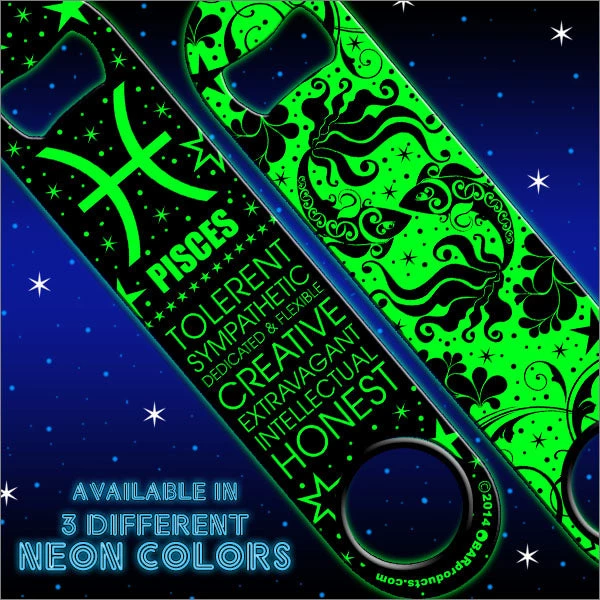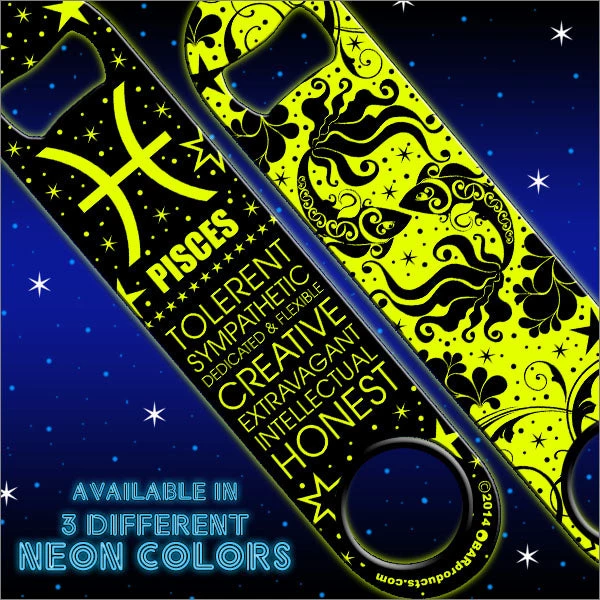 What’s your sign and what does it say about you? We have created a line of NEON Zodiac Sign Speed Bottle Openers you are sure to love. Each of the 12 designs are available on 3 different colored neon openers… Green, Yellow and Pink. They feature all symbols relevant to your astrological birth sign, as well as your characteristics. These bottle openers glow vibrantly under black lighting for the added “space-like” effect.