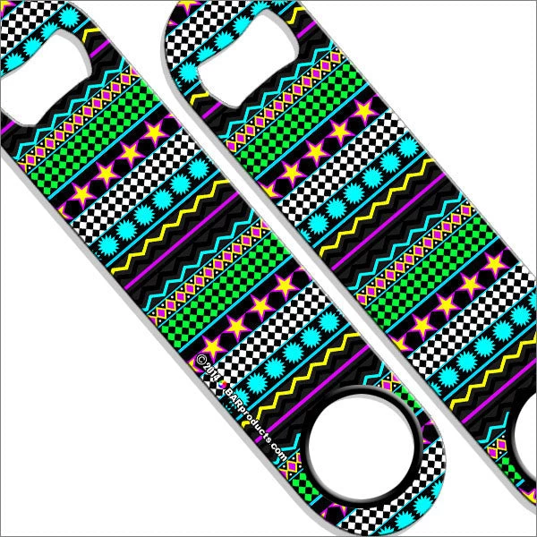 Not only are Geometric Aztec designs trendy, but they look beautifully eye catching when decorating our popular “Speed” Bottle Openers. This version (6) design offers a fun and complimenting collection of vibrant colors, green, black, white, yellow, aqua and pink.