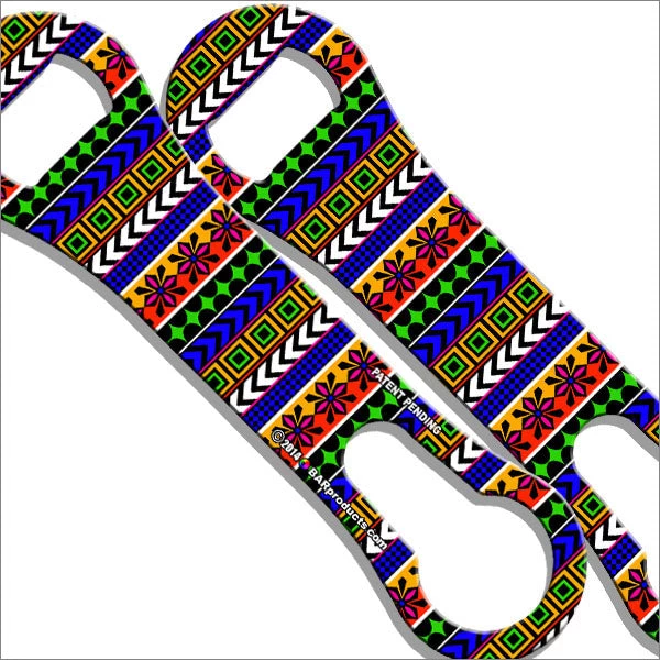 Geometric Aztec designs are not only trendy, but look extremely eye-catching when decorating our V-Rod Bottle Openers. This version (4) offers an oddly complimenting collection of vibrant colors, blue, red, black, green and orange.