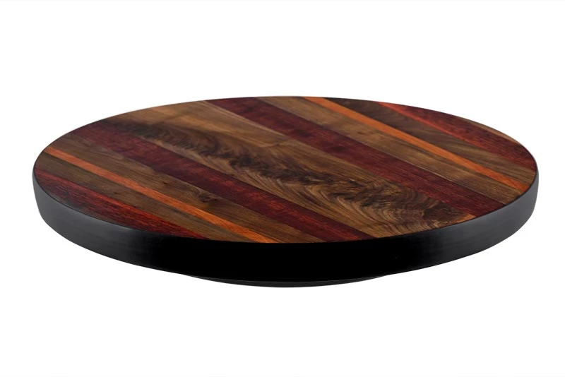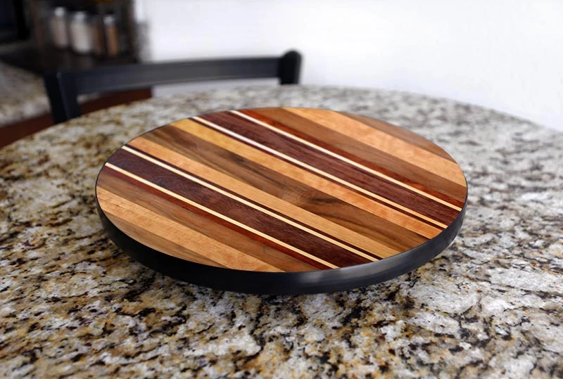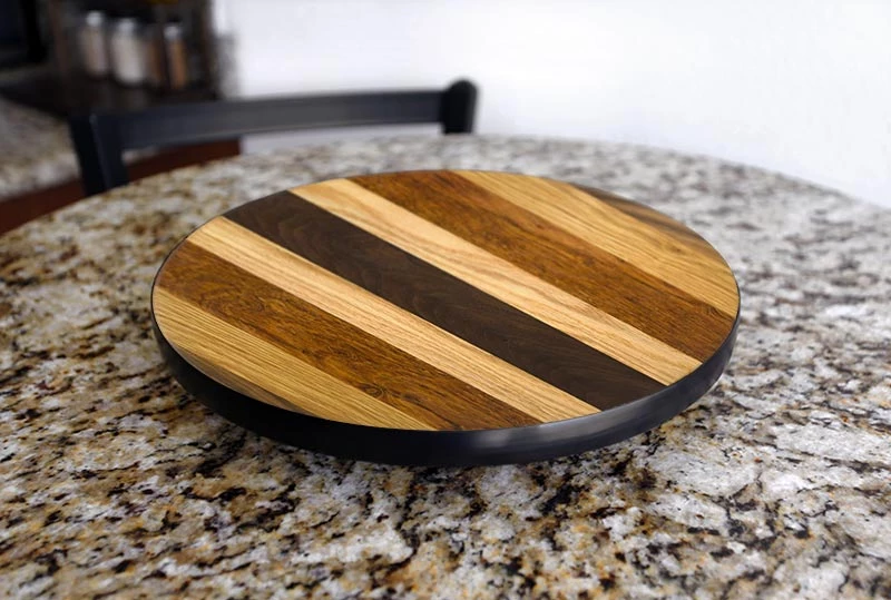 These beautiful Lazy Susans are 3/4″ thick, and come in three different sizes, 12″, 16″, and 24″, meaning there’s a size available for any table or counter space. The round base is sturdy, and the spinning mechanism is well-built and allows for smooth, easy spinning, and featured 4 rubber stoppers that protect your table top from wood scraping. The Lazy Susan is wrapped with rubber black T-molding that protects the side of the all-natural wood top.