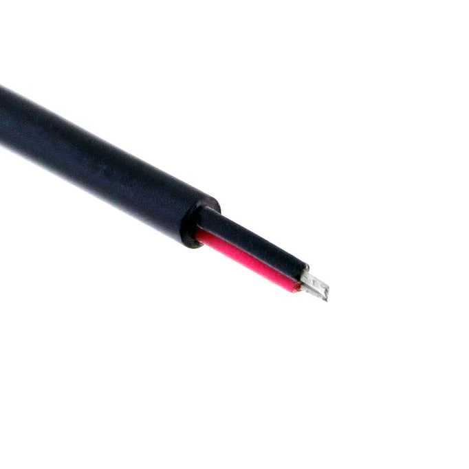 This DC Power Adapter is 6 inches long and is used to connect the pigtail to power our LED lights. It features a female coaxial power plug on one end to two bare wires on the other. Black and red wires indicate polarity. It’s a simple and effective solution for power connectivity.