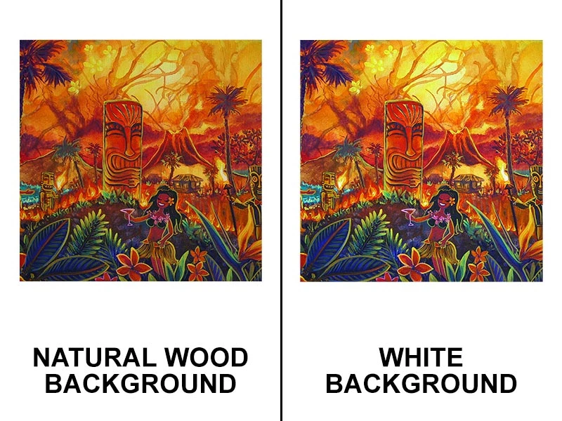 Available in either a Natural Wood background or a White background. The texture of the wood shines in the Natural Wood option, while the whites from the art are more vivid with the White option.