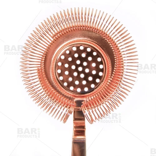 This long handled No Prong Cocktail Strainer is made to fit in any shaker. It is made of durable stainless steel with copper plating that adds an elegantly vintage look to any barware set. With this tool you will get a superior strain every time and never have a problem removing the ice from your cocktail. The tight fit of this strainer’s coils along with having no prongs allows this strainer to fit snug inside the mouth of the cocktail shaker or mixing glass. Constructed with highly-reflective copper plated stainless steel this professional grade cocktail strainer is made to last!