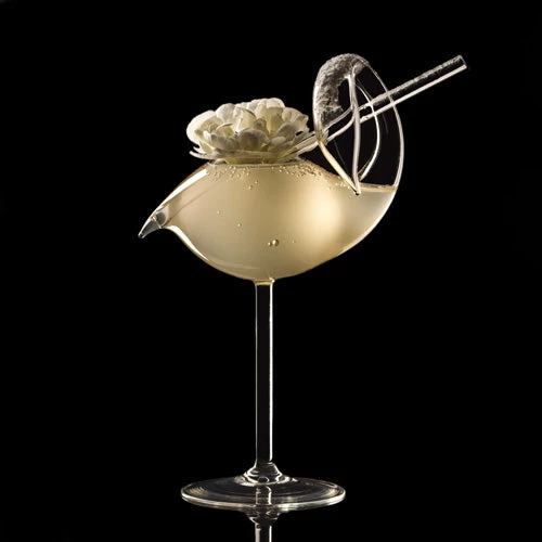 Swan Shaped Cocktail Glass with Straw. Elegant swan-shaped cocktail glass is made of lightweight, strong borosilicate glass. Grace and beauty swan stemware for your signature drink, champagne, wine and other spirits easy and fun. Holds 3 oz. and Stemmed glass measures 8″ high and 3 1/2″ wide.