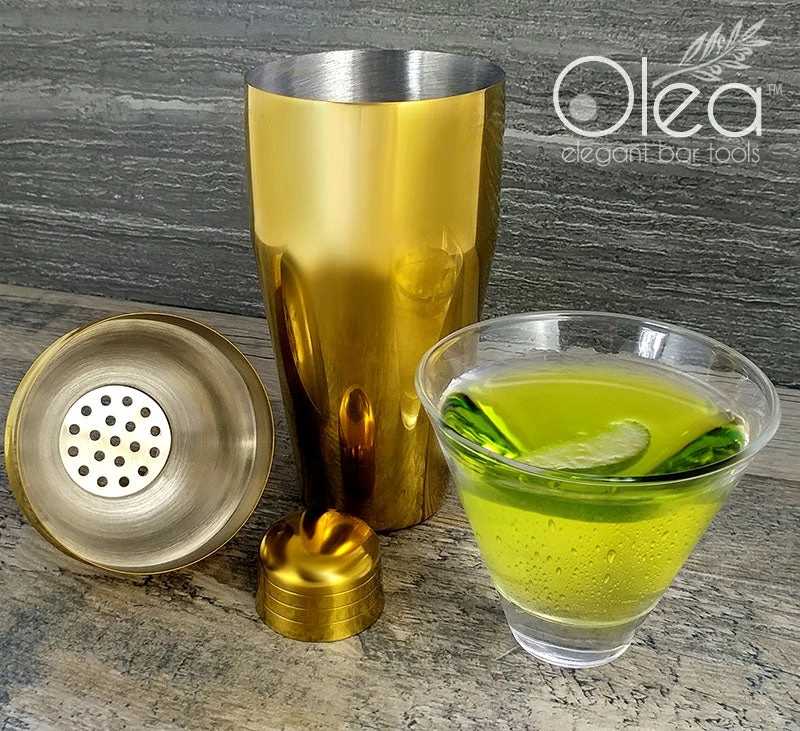 Absolutely exquisite are the perfect words to describe this stunning Gold Plated cobbler style cocktail shaker. One of the first editions to our line of Olea™ Elegant Bar Tools, this 3 piece shaker is every master mixologists and professional bartenders dream bar tool. This high end cocktail shaker is constructed from a durable stainless steel material and then beautifully plated with a reflective Gold finish.