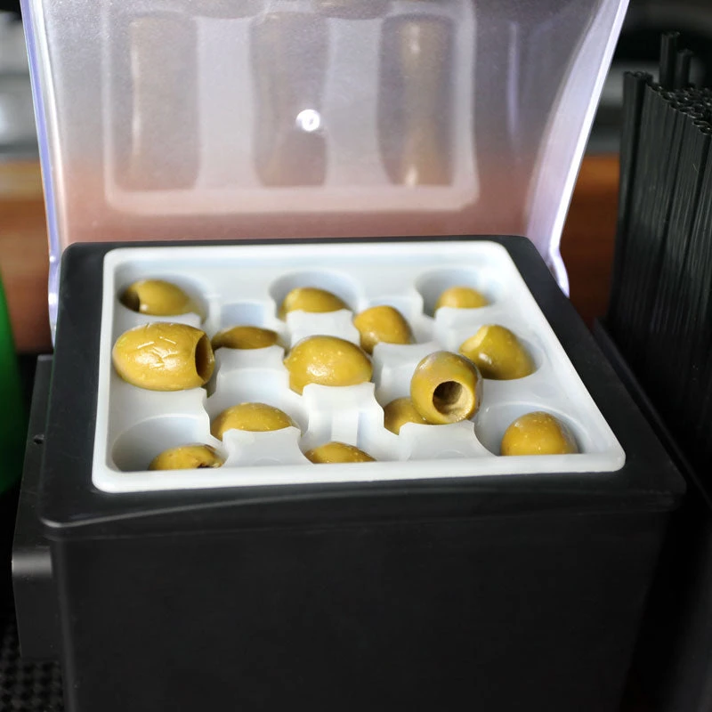 Save time during those busy shifts by skewering your olives and other garnishes ahead of time. This OliveNest fruit tray insert allows you to pre-assemble your garnishes by stacking them into individual compartments. When you’re ready to use them, simply stick a pick or skewer into the stack and serve. Each OliveNest has 13 pods that are 2 ½ inches deep. Fits most condiment holders and fruit trays.
