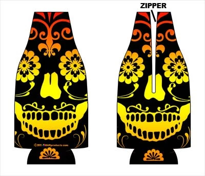 Here is a bottle Cooler design that is based off of the popular Sugar Skull fad. A flowery and flowing skull design with contrasting colors makes this bottle Cooler a great one to have on hand. The zipper accessory built into this top quality neoprene material makes for quick and convenient replacement of bottles.