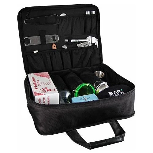 The Bar-Tote is a durable, all-black, water-resistant, nylon tote designed to carry an assortment of bartending and personal items. It measures in at 14″W 12″L 4.5″D and has 16 compartments varying in size to fit your every bar tool need from jiggers and shakers, to calculators and aspirin. This large bar tote comes equipped with easy carry handles and a removable strap for shoulder carry.