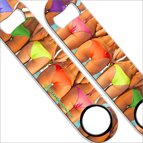 Mutli-colored bikinis on beach babes is all this bottle opener is about. It’s sure to be the attention-getter in your bartending tool collection!