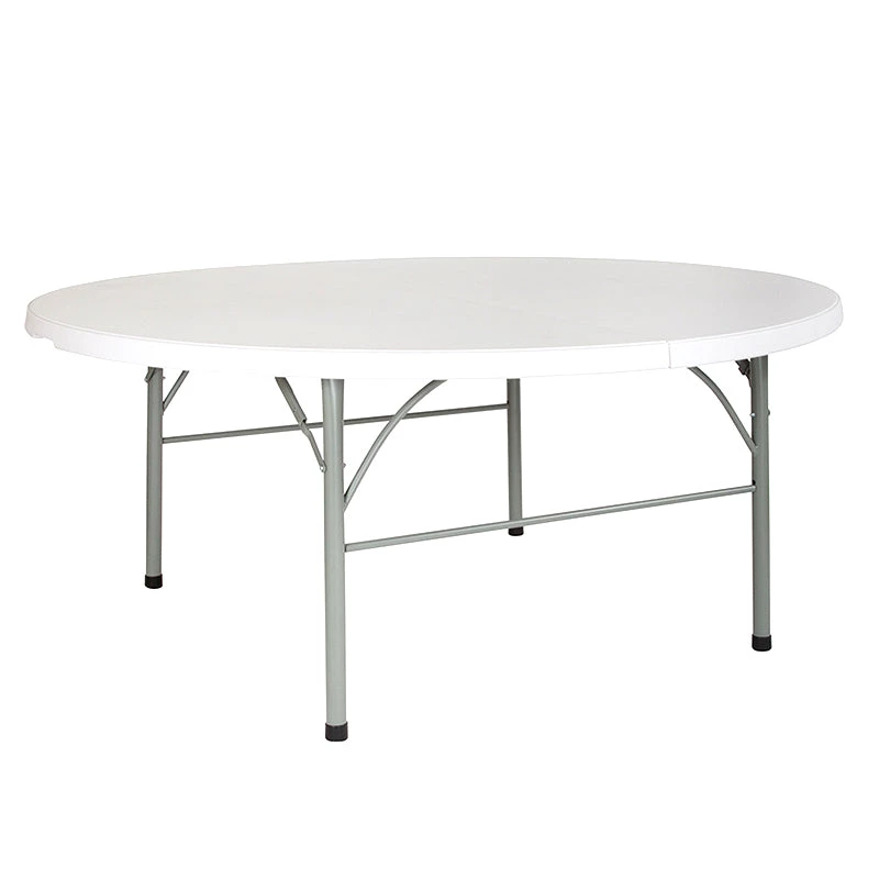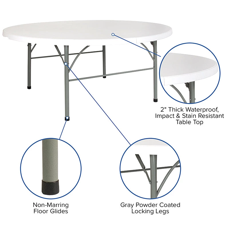 The round folding table is a great option for special events, catering companies and banquet facilities. This durable, easy to clean table is commercial rated for use in banquet halls, convention centers and at trade shows. The granite white tabletop is 6′ in diameter, 2″ thick, and will comfortably seat up to 8 adults. It is waterproof, impact and has a stain resistant top. Attractive gray powder coated legs lock securely in place while in use and non-marring floor caps protect your floor by sliding smoothly when you need to move the table. The table folds in half, making it easy to store and transport, using the convenient carrying handle attached on the side. When used for outdoor events, store indoors to protect the frame from extreme moisture.