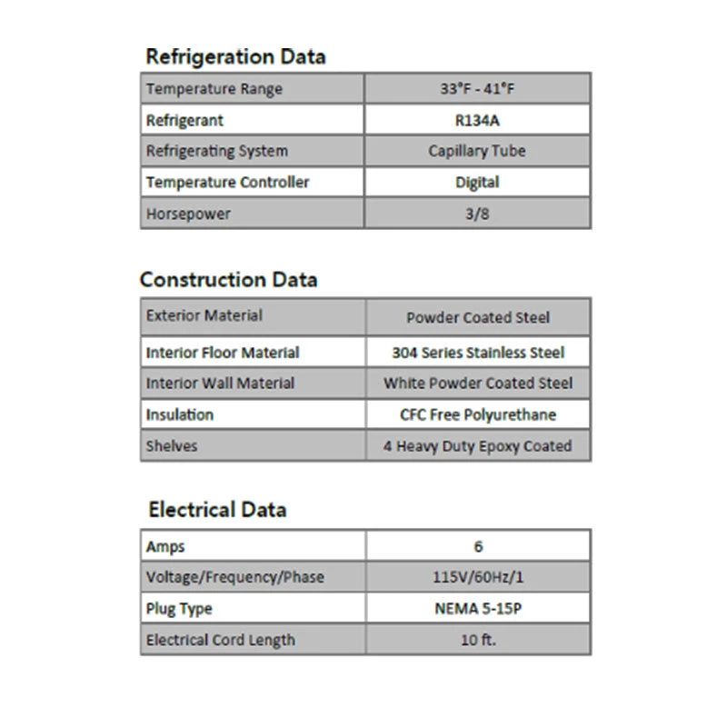Swing glass door refrigerator that is energy efficient technology and provides an attractive well illuminated point of purchase while maintaining precise temperatures. Comes with full door length lighting and bright back-lit panel. Snap-in magnetic door gaskets that are easy to remove and replace. Four heavy duty adjustable shelves for precise display of merchandise. Has front mounted electronic thermostat digitally controlled temperature system maintains optimum temperature with easily viewed LED display. Easy to move around with four 1″ wheels with front leg levelers. Ask for our freight quote.
