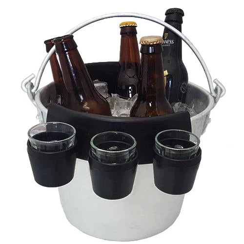 The “Six Shooter” Bucket Clip Shot Holders are the perfect way to upsell a beer bucket by adding shots! The high quality plastic shot holders clip onto a beer bucket to hold three standard shot glasses. The black shot holders are stackable making for easy storage and use at any bar. Sold in pairs of two shot holders. They are light weight and pair perfectly with our Aluminum Ice Bucket and BarConic® Shot Glasses.