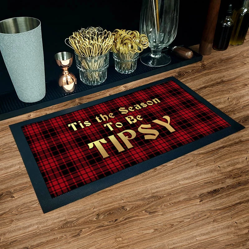 Service mats add a great utility to bar and kitchen tops by protecting them from splatters and spills during high traffic service. The durable rubber matting on the bottom and framing the sides will hold the mat securely in place. This holiday inspired design will definitely bring the perfect decor element to your bar or kitchen. These mats can also be used as place settings.