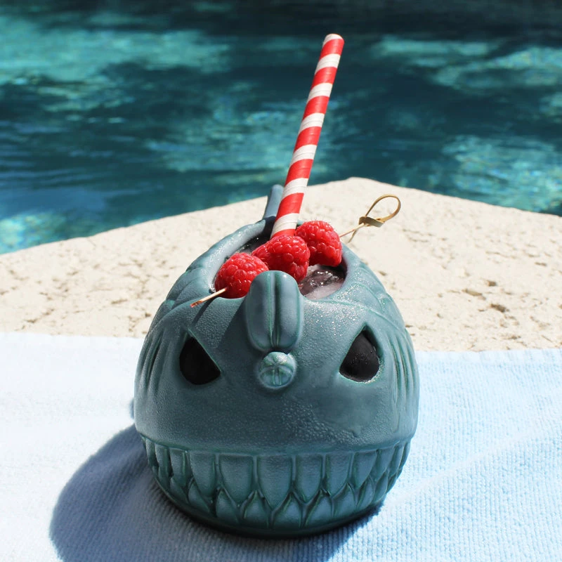 This beautiful ceramic piece is hand molded into a stylish and fun drinking vessel. The light blue and green glaze offers a smooth yet detailed feel of the scales, while the black eyes offset the fish to give it a daring and bold look. This ferocious little guy stands approximately 3” high, 7” long, and 4” wide. He will hold up to 16oz of your favorite Polynesian concoction and provides a great element to your cocktail introduction. Don’t forget to pair this tiki mug up with some other great tiki themed accessories by clicking here: Tiki Accessories