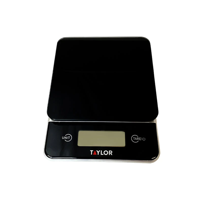 Digital kitchen scale with black tempered safety glass platform. Easy to switch between units for containers and food. The sleek black glass platform will not stain or absorb odors. Has a large display with auto shut off to save battery life. Clean with a damp cloth, do not immerse in water or place in the dishwasher. Max weight is 11 lbs. Measures 7.5” x 5.5” x 0.75”
