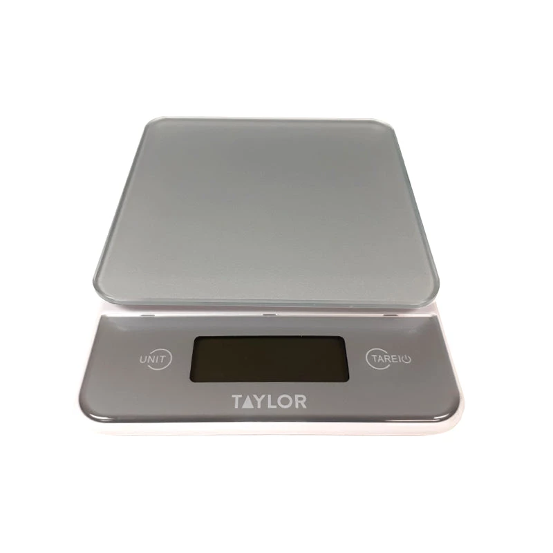 Digital kitchen scale with silver tempered safety glass platform. Easy to switch between units for containers and food. The sleek silver glass platform will not stain or absorb odors. Has a large display with auto shut off to save battery life. Clean with a damp cloth, do not immerse in water or place in the dishwasher. Max weight is 11 lbs. Measures 7.5” x 5.5” x 0.75”