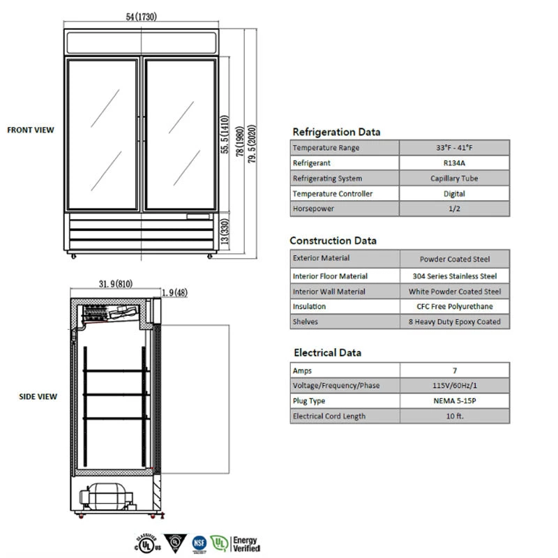 Swing glass door refrigerator that is energy efficient technology and provides an attractive well illuminated point of purchase while maintaining precise temperatures. Comes with full door length lighting and bright back-lit panel. Snap-in magnetic door gaskets that are easy to remove and replace. Eight heavy duty adjustable shelves for precise display of merchandise. Has front mounted electronic thermostat digitally controlled temperature system maintains optimum temperature with easily viewed LED display. Easy to move around with four 1″ wheels with front leg levelers. Has removable bottom grill slide-out condensing unit for easy maintenance. Ask for our freight quote.