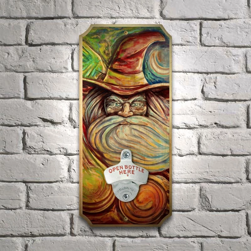 This Wall Mounted Bottle Opener with “The Wizard” art from Featured Artist Brian Mohr is the perfect way to open beer bottles in your kitchen, bar, or even on the patio! It features a durable cast iron bottle opener and has 2 pre-drilled holes so you can mount it on any wall. The art is printed directly onto the wood in bright, vivid colors, making this a bottle opener that really stands out!
