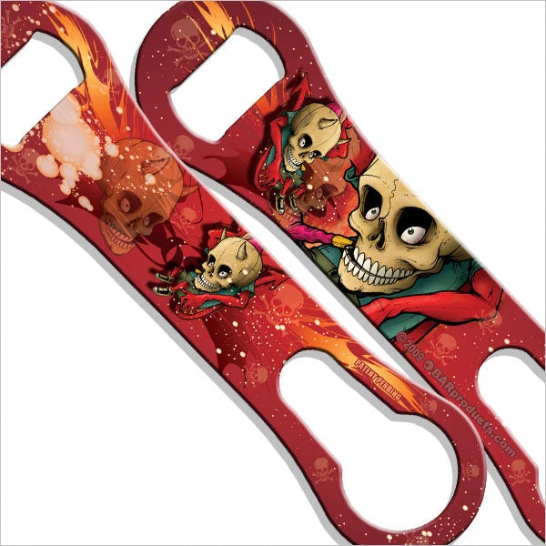 One for the devilish bartenders. This V-Rod™ is full of dark spirit and wicked design. A splattered, blood red background matches the horned skulls of little devils on this evil yet handy bartender’s bottle opener.