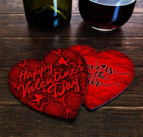This series of Valentine’s Day coasters is the perfect gift idea for your sweetheart on this special occasion! Featuring 2 different fun messages including the classic “Happy Valentine’s Day” and “Love is in the Air” that are sure to be the perfect gift for your significant other. Full color artwork is vibrantly depicted on these cork bottom heart shaped coasters. Each heart shaped coaster has a high gloss surface so all colors really jump out, and the bottom of the coaster features a non-slip, non-scuff cork bottom.