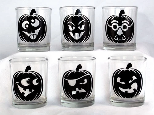 These six adorable and mean little jack o’lantern pumpkin designs are on our larger 2.5oz shot glasses. They work great as votive candle holders, which is perfect to make miniature jack o’lanterns with as the candles glow through the printing! Perfect for parties, you can use them year after year as decoration, too! They make a great gift for friends this time of year or decor for a party whether at home or in a restaurant or bar.