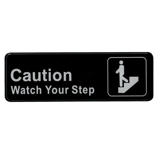 The “Watch Your Step” sign is the perfect addition to your restaurant or bar for safety compliance. This sign features the phrase “Caution Watch Your Step” printed clearly, in bold, high-contrast letters. The sign measures 9″ x 3″ and is packaged complete with self-adhesive backing to make installation simple and easy. This is an essential safety notice for locations in the establishment with stairs or steps. The sign comes with clear directions in the packaging and can be applied to any non-porous surface including walls, windows, and doors.