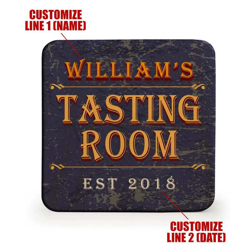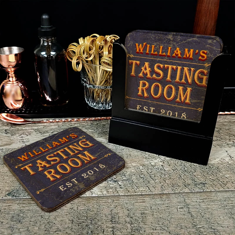Looking for a non-disposable coaster solution that will look phenomenal displayed on your bar or table tops? How about one that is easily customizable and showcases a trendy “Tasting Room” design theme? These custom wood coasters are just what you’ve been looking for! Handcrafted in the USA, these high quality coasters allow for full color design while featuring a rustic wood element. Very easy to customize, simply type in your text and we do the rest! These coasters also make for a great gift idea! 4 inch square shape with rounded corners. Sold in packs of 4 with a wooden coaster caddy add-on option.