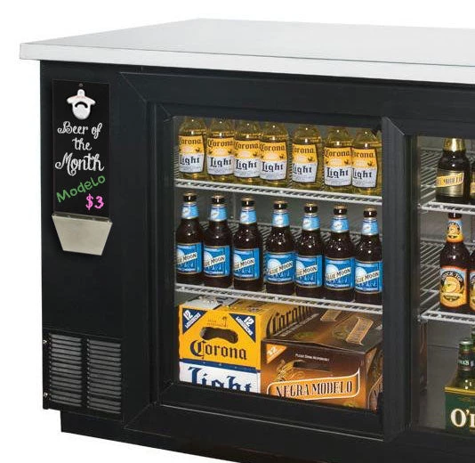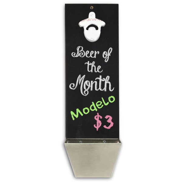 The Chalkboard Wall Mounted Bottle Opener with Cap Catcher is a fun and unique bottle opener that can be customized in any way you like. The board has plenty of room to allow you to write specials, messages, or just draw pictures on. The cap catcher is also removable so it is easy to empty and keep clean!