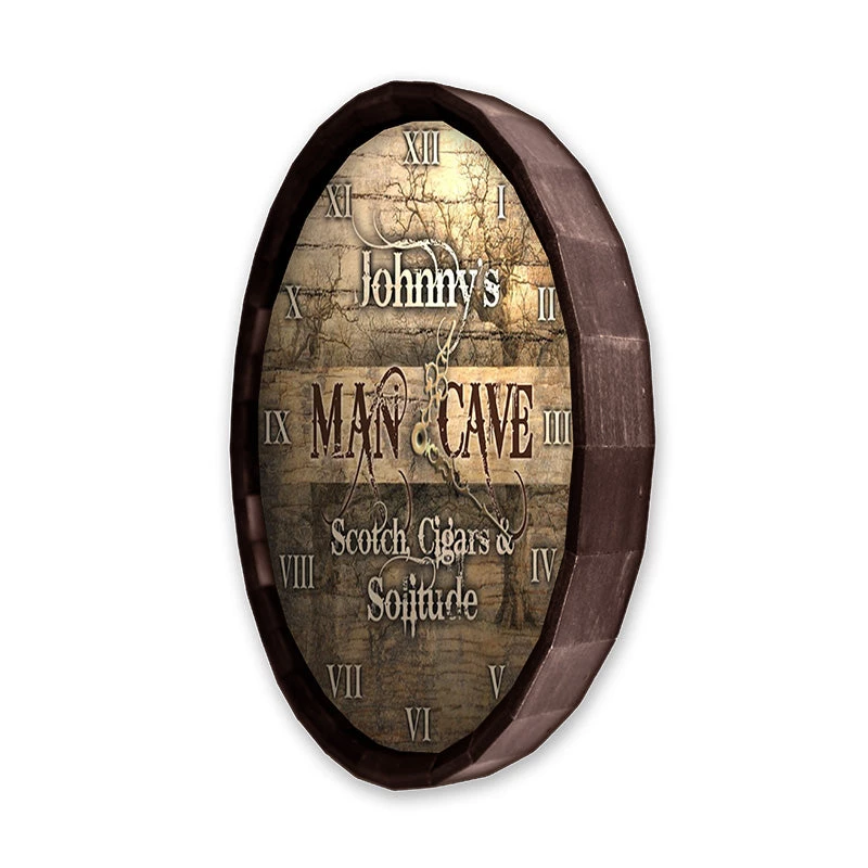 This handsome barrel top wood clock is the perfect way to add some style and practicality to any setting. The simple and clean look of this piece enables it to seamlessly blend into any environment. Designed to suggest a previous functionality as the lid of an old whiskey barrel, the rugged implication makes it the perfect decoration for any man cave or testosterone zone. The weathered and distressed style of the wood creates the perception that this lid has withstood frequent use yet still remains useful. The suggestion of resilience and endurance makes this a highly desirable and sought after barrel top wood clock, as it adds an authenticity that instantly creates a historical back story. Handcrafted in our wood shop by a team of skilled artists, each wood barrel clock is made to order giving you the ability to customize, and make it a personal piece of art. An image of an old battered tree in the background adds to the masculine feel. This man cave wood barrel top clock makes for the perfect gift and a great addition to any home decor, bar or restaurant.