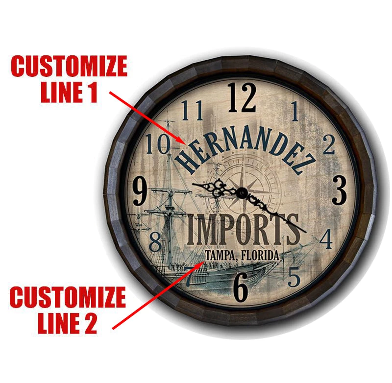 With this “Imports” template design, you have the ability to add your own name and your city / state of preference. It also makes for a great gift idea to the history buff in your life. It features a nautical design theme that beautifully blends with the barrel tops wood grains. The clock itself functions off of a mini quartz movement piece (that takes 2AA batteries – not included) and features classy, serpentine style black clock hands (hour and minute). Just like all of our wood shop products, this barrel top clock is handmade in the USA.