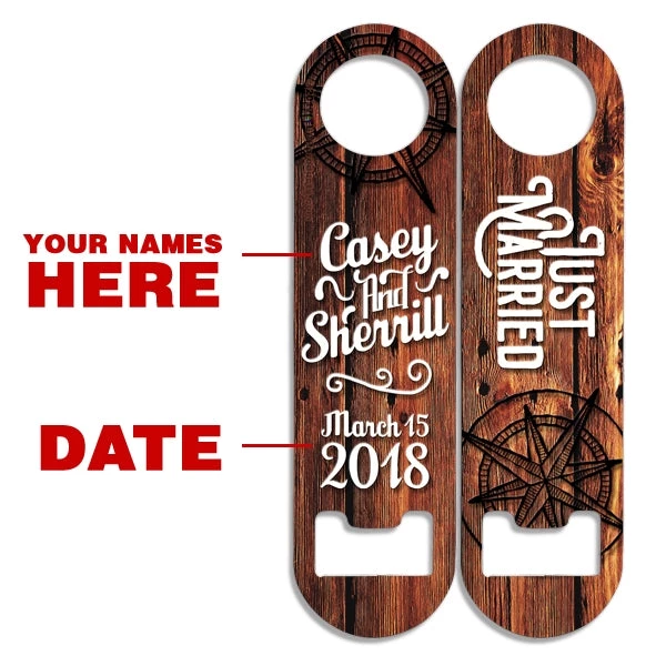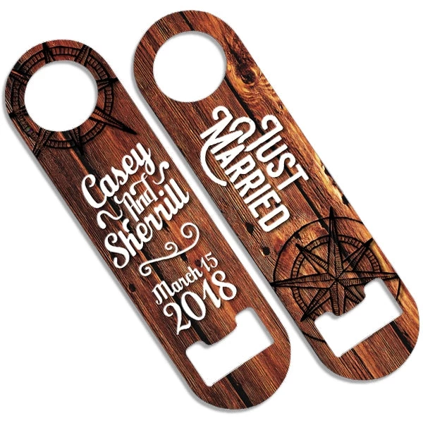 If you are someone that is a fan of our mini style speed openers then you are sure to love this Skinny Mini Bottle Opener! Choose from a large selection of fun coloful designs, such as this “Just Married” design template that can be customized with your very own name! Simply type in your text and our design team will do the rest!