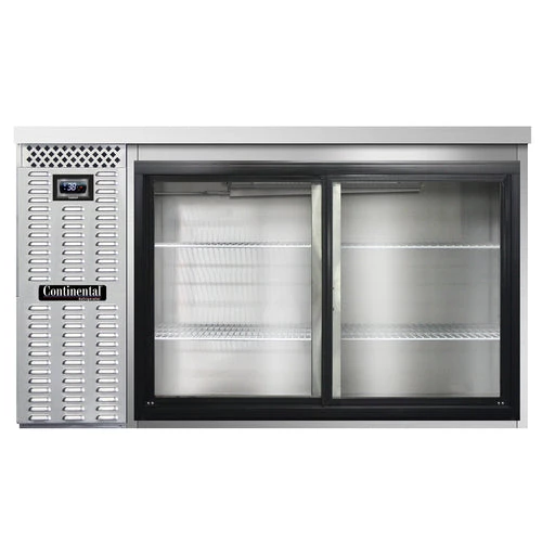 Refrigerated Back Bar Cooler, 59″W, 34-3/4″H, 22.0 cubic feet, front breathing, stainless steel top, sliding glass doors, electronic controller with digital display & hi-low alarm, stainless steel exterior, stainless steel interior back & side panels with reinforced stainless steel floor, epoxy coated steel shelves, self-contained refrigeration, R290 Hydrocarbon Refrigerant, 1/4 HP, cETLus, NSF, Made in USA MAP POLICY