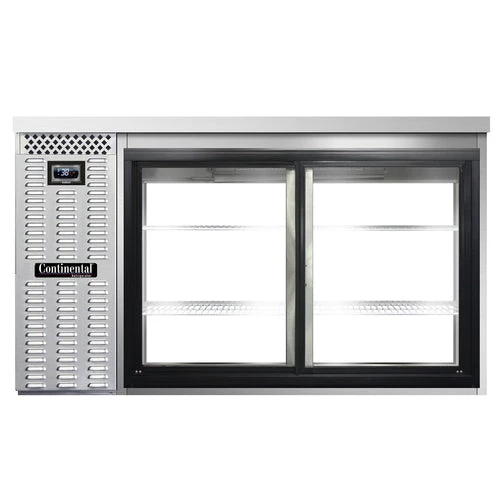 Refrigerated Back Bar Cooler, pass-thru, 59″W, 34-3/4″H, 22.0 cubic feet, front breathing, stainless steel top, sliding glass doors, electronic controller with digital display & hi-low alarm, stainless steel exterior, stainless steel interior back & side panels with reinforced stainless steel floor, epoxy coated steel shelves, self-contained refrigeration, R290 Hydrocarbon Refrigerant, 1/4 HP, cETLus, NSF, Made in USA MAP POLICY